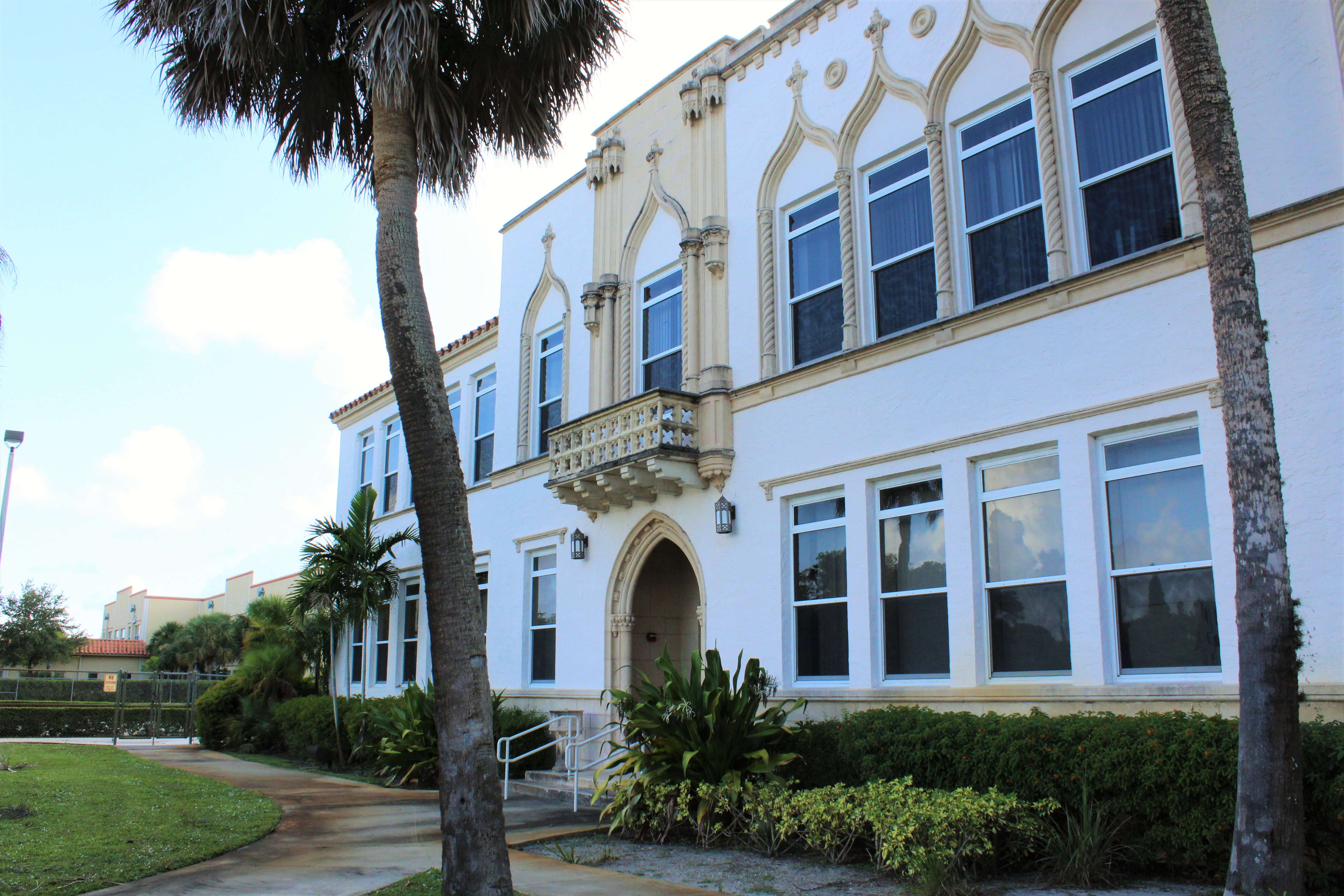 Designed by architect William Manly King, the principal designer of all Palm Beach County schools built in the 1920s, Jupiter School is an excellent model of the Mediterranean Revival Style. It has a parapeted and barrel tiled roof, stucco exterior finish, and ogee and pointed arches over the doors and windows.